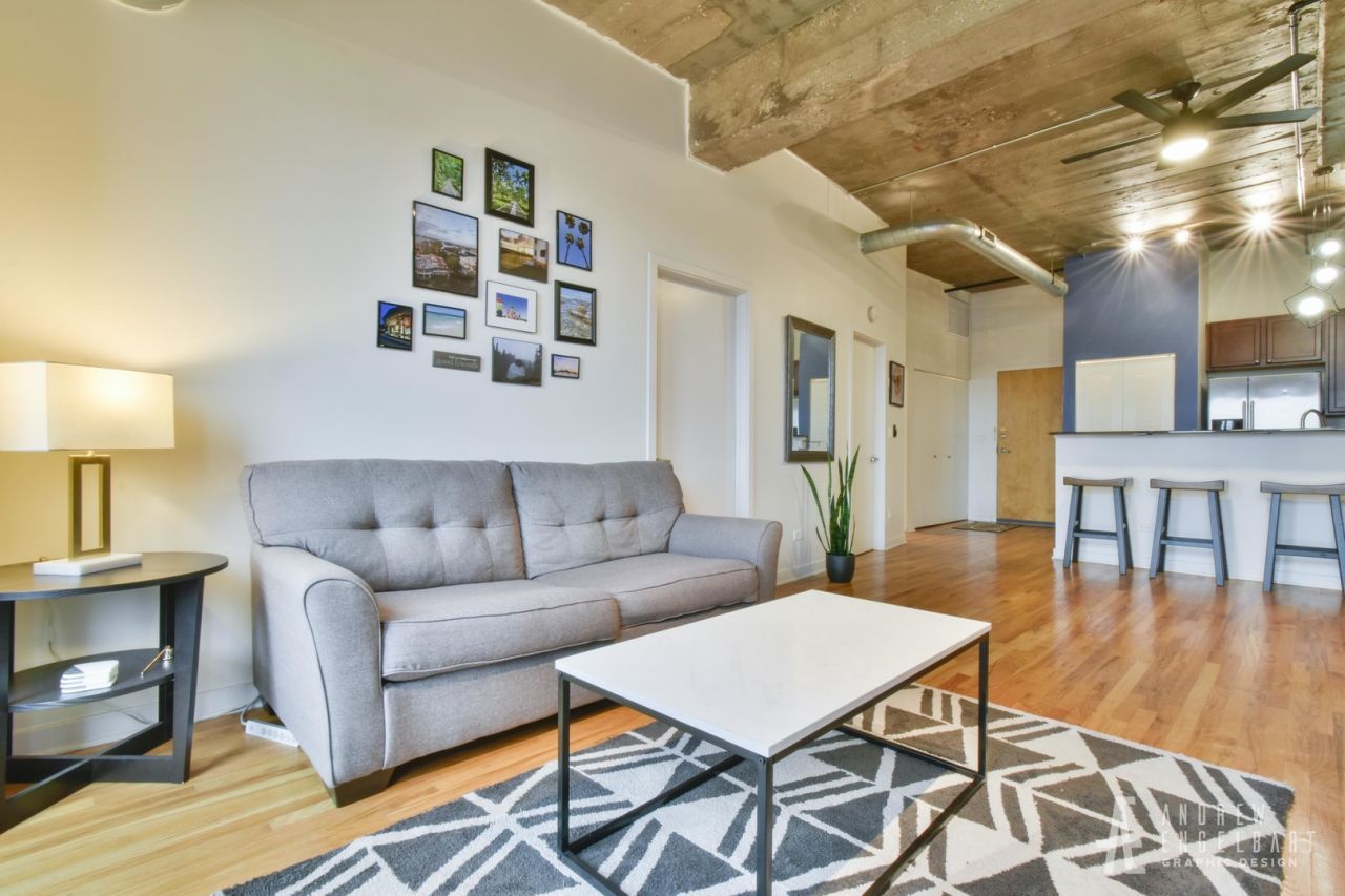 Brighten your days in this sun-drenched, south-facing one-bedroom plus den/one-bath loft-the largest floor plan in the building. Boasting fully enclosed rooms, a private suspended balcony, soaring ceilings, and luxe architectural details, the home is flooded with natural light and features hardwood floors throughout the main living areas. The open-concept layout is anchored by a striking granite-clad fireplace and flows seamlessly into a well-appointed galley kitchen. Enjoy granite countertops, stainless steel appliances, rich cherry cabinetry, and an elongated breakfast bar illuminated by a contemporary three-tier cube chandelier. Retreat to the primary bedroom, which offers plush neutral carpeting and two spacious double closets. Everyday convenience is elevated with a full-size in-unit washer and dryer. Embrace the carefree lifestyle of University Commons, an amenity-rich community featuring a heated outdoor pool, award-winning landscaped grounds, pet-friendly walkways, and a wraparound rooftop deck with breathtaking skyline views. Residents also enjoy a fitness center, party room, rentable theater, and dedicated on-site management. Ideally positioned between the vibrant neighborhoods of Pilsen, the West and South Loop, and the UIC campus, this home offers effortless access to Chicago's best dining, culture, and transit. Multiple public transportation lines are just steps away, with quick connections to all major expressways. A heated, secure garage parking space is available for 30k. Truly a must-see-schedule your private tour today!