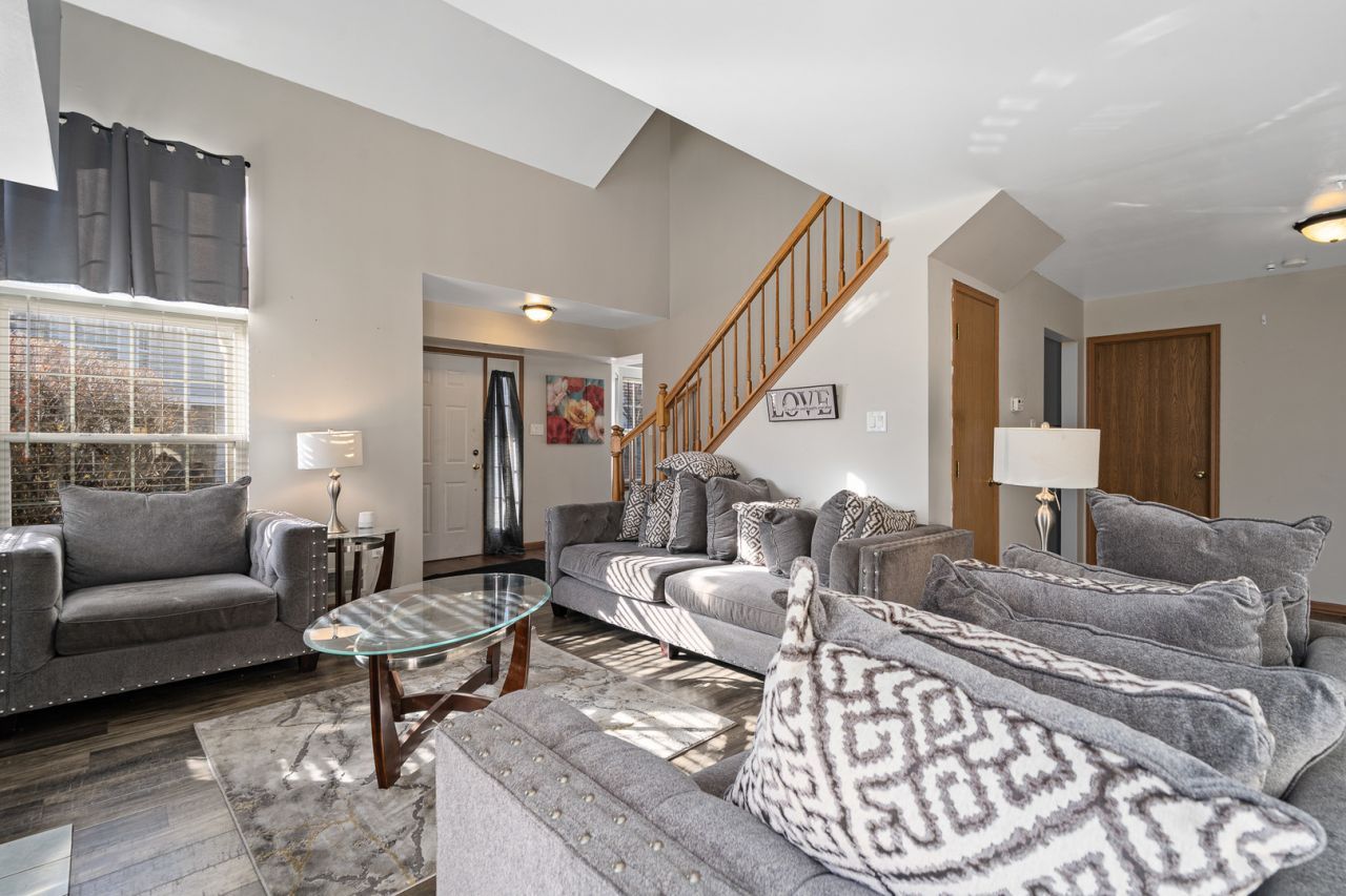 Welcome to this beautifully updated and spacious townhome offering modern elegance and a bright, open-concept floor plan in sought-after Cambridge at the Reserves. Step inside to discover a stunning updated kitchen featuring stylish gray cabinetry, all appliances, and luxury plank flooring that flows seamlessly throughout the main level. The dramatic vaulted living room is bathed in natural light and showcases a cozy gas-start fireplace, creating the perfect ambiance for relaxing or entertaining. A glass door opens to your private patio, ideal for morning coffee or evening gatherings. Upstairs, the impressive vaulted loft overlooks the living room and provides an inviting flex space for a home office, den, or reading nook. The convenient second-level laundry room with utility sink adds everyday ease. The luxurious master suite boasts a large walk-in closet and access to the updated shared bath featuring a raised gray vanity and a soothing soaker tub. The spacious second bedroom includes two closets, one of which is a generous walk-in. Additional highlights include an attached garage and a prime location close to downtown Plainfield, shops, dining, and easy expressway access. This home perfectly blends modern updates, thoughtful design, and a fantastic location-a true gem in Cambridge at the Reserves!