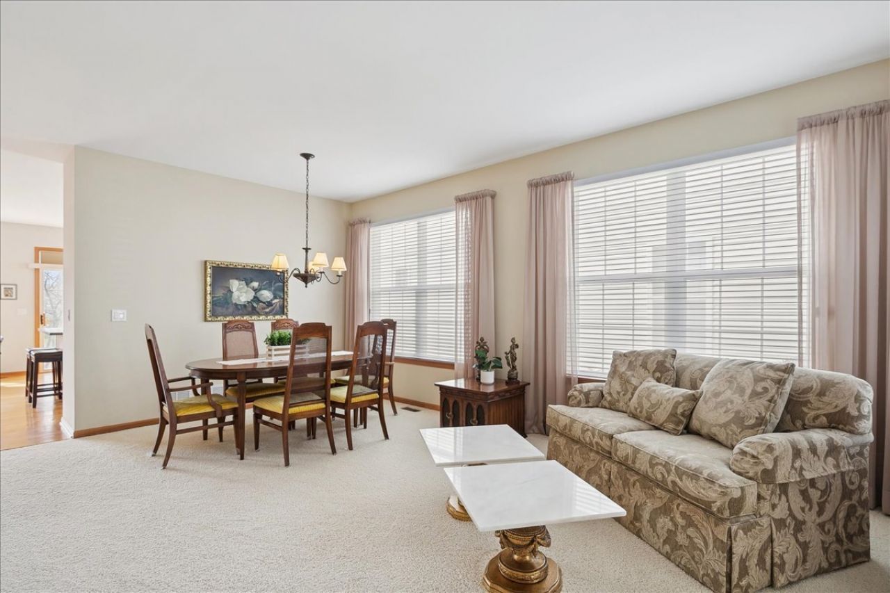 Located in the highly desirable Carillon North 55+ gated retirement community, this amazing 2-bedroom, 2 full-bath ranch home with a den/office and a 2-car garage offers both comfort and convenience. Set within a beautiful community featuring ponds, walking trails, and a variety of activities, residents also enjoy access to a clubhouse with tennis/pickleball courts, heated pool, and more. This outstanding home, with custom window treatments, offers a desirable layout with an abundance of natural light. The spacious living and dining room combination is perfect for entertaining, while the eat-in kitchen features wood cabinetry, ample counter space, and an island that flows seamlessly into a family room addition with a wall of windows overlooking the backyard. Step outside to a concrete patio surrounded by mature trees and professional landscaping. The primary suite includes a private bath with a tub, walk-in shower, and a large WIC.. An additional spacious bedroom, den/office, and full bath complete this ideal first floor layout. The unfinished basement provides potential for additional living space along with abundant storage and bathroom rough-in. Conveniently located near shopping, dining, golf courses, and the Rollins Savanna Forest Preserve with beautiful walking and biking trails, this home offers an exceptional location and lifestyle. Updates include the roof (2017), water heater (2019), furnace (2016), and dual capacitor in the AC (2025).