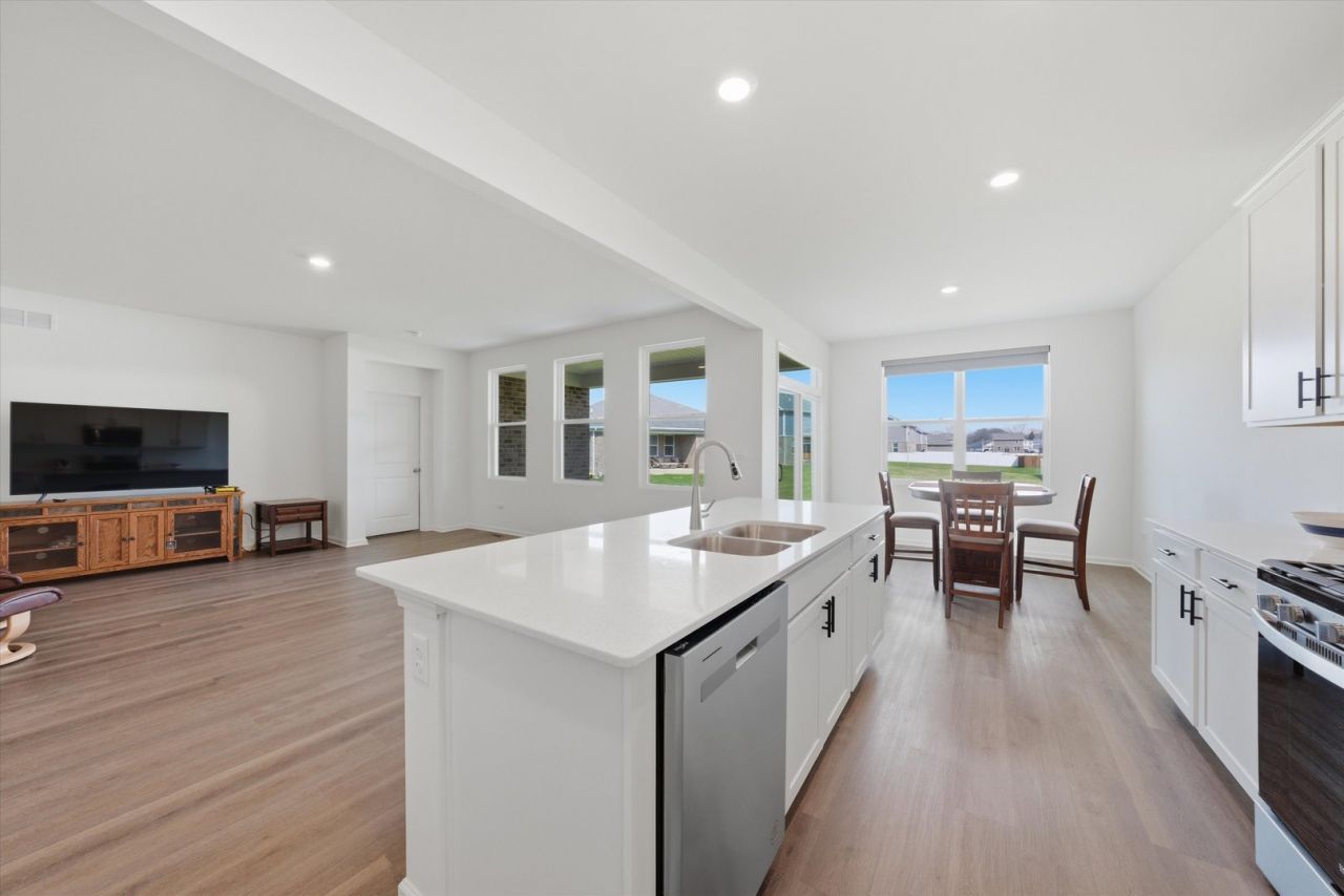 Quality-built ranch offering 4 bedrooms and 2 full baths, including a spacious primary suite featuring a raised double-sink vanity with quartz countertops and a beautifully finished ceramic walk-in shower with clear glass doors. This open-concept floor plan seamlessly connects the great room and kitchen-perfect for both everyday living and entertaining. The kitchen is thoughtfully designed with a large island with seating overhang, 42 designer white cabinetry with crown molding, soft-close drawers, a walk-in pantry, stainless steel appliances, quartz countertops, and luxury vinyl plank flooring. No corners were cut in this exceptional build, featuring a high-efficiency furnace, tankless high-efficiency water heater, and a Broan fresh air system for added comfort and efficiency. Additional highlights include a huge basement ready for your ideas and a 3-car garage and a covered rear patio. One of the few ranch-style homes available in this subdivision-this one won't last!